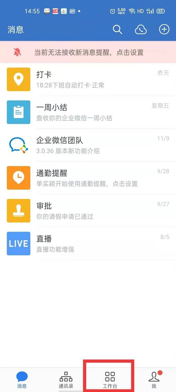 第一步,打开企业微信客户端,点击页面下方的【工作台】按钮。