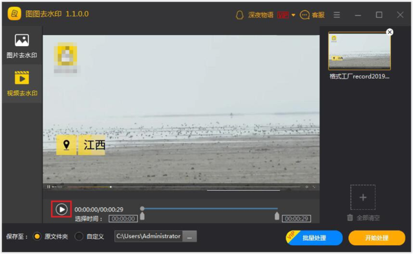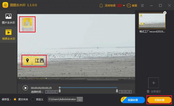 第四步,然后使用方框来将水印的位置选择好,接着点击软件界面右下角的【开始处理】按钮,就可以开始去水印了。