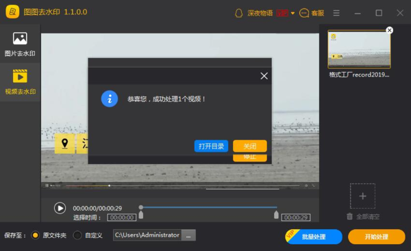 第五步,稍等一会儿后,软件就会弹出处理成功的提示信息,我们点击提示信息中的【打开目录】按钮,即可进入到视频的存储位置