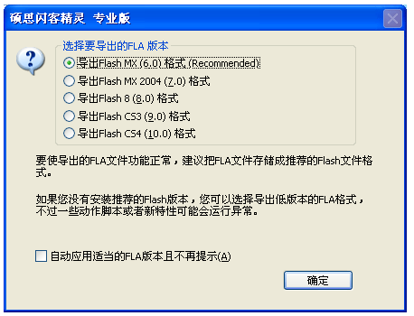 第四步,在新弹出的提示框中,选择【FLA版本】,最后点击【确定】就大功告成了。