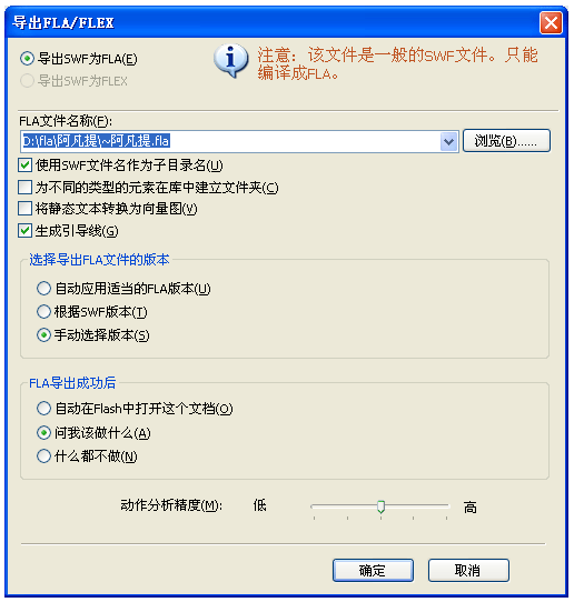 第三步,确认SWF资源之后,点击【导出FLA/FLEX(F)】并勾选【导出SWF为FLA】,然后选择好存储位置,点击下面的【确定】。