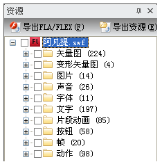 第二步,先选择SWF文件已经添加进来的,并在【资源】对话框中,点击文件名称前面的【+】展开所有元素。