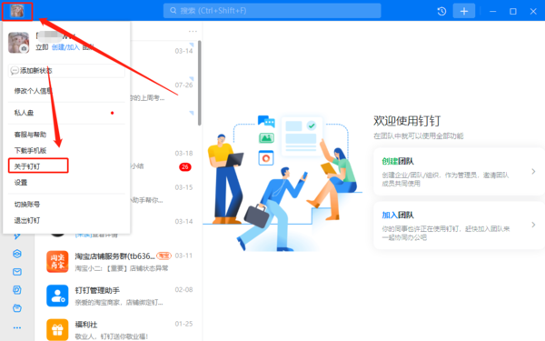 首先打开电脑中的钉钉,点击左上角的头像,然后在下方出现的菜单中选择“关于钉钉”。