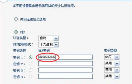 第二步,登陆之后,点击【无线设置】下面的【无线安全设置】,然后勾选【WEP】,在【密码类型】除勾选【64位】,然后在【密钥1】处输入【10位数字】如下图所示。
