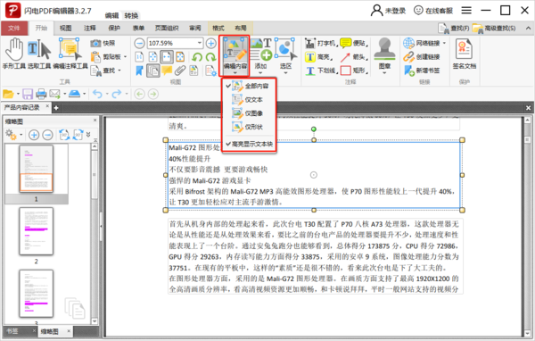 第三步,PDF文档打开好以后,如果我们想要对文件当中的内容进行编辑,我们就找到界面顶部【开始】选项卡当中的【编辑内容】功能,并点击,接着我们就可以看到在此拥有【全部内容】、【仅图像】、【仅文本】和【仅形状】多种编辑方式,我们根据自己的需要来进行相应的编辑方式的选择即可。