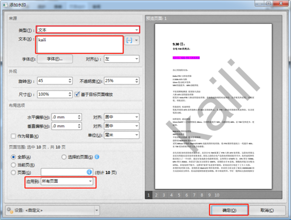 第六步,然后在弹出的【添加水印】的窗口当中,找到水印的【类型】,将其选择为【文本】,然后在其下方的【文本】内容当中,输入你想要添加的水印文字内容,接着在找到【应用到】选项,将其选择为【所有文档】,最后点击窗口右下角的【确定】按钮即可。