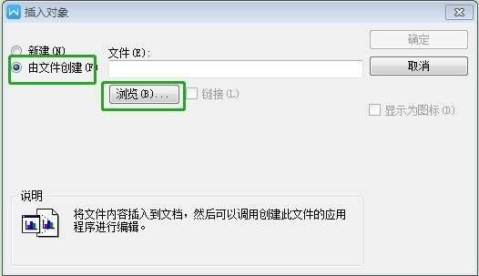 然后是插入PDF文件,在【对象】子窗口中,进入【由文件创建】页面,点击【浏览】,完成文件添加。