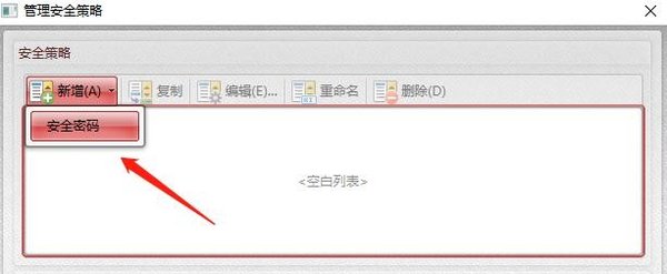 第三步,这时候会有一个【管理安全策略】对话框,我们只需要点击【新增】下面的【安全密码】即可。