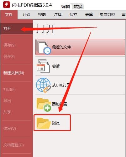 第一步,在电脑上打开闪电PDF编辑器,点击左上角的【文件】下面的【打开】,然后点击【浏览】并选择需要进行加密的PDF文档,加入到PDF编辑器中。