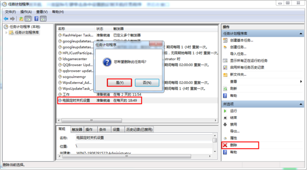 第十三步,如果我们不想要对电脑进行定时关机的操作了,此时就需要取消【电脑定时关机设置】的任务,此时我们只需要在【任务计划程序】窗口当中,找到【电脑定时关机设置】任务选项,并鼠标单击选中此任务,然后在窗口的右侧的下方,找到【删除】选项,然后单击,接着在弹出的提示窗口当中,选择【是】,最后我们就可以将自己设定的电脑定时关机程序删除掉了。