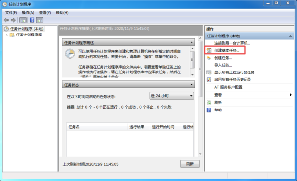 第五步,进入到电脑的几任务计划程序窗口当中后,我们在此窗口的右侧界面当中,找到【创建基本任务】选项,然后点击打开,开始创建新的任务。