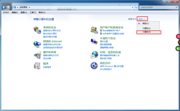 第二步,进入到电脑的控制面板主页后,我们找到界面右上角的【查看方式】处,然后点击【类别】按钮,将类别选择为【小图标】。