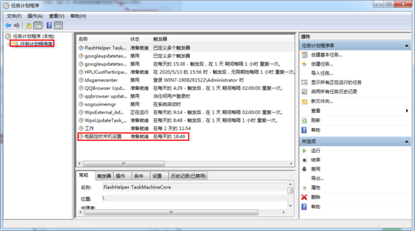 第十二步,接着回到【任务计划程序】的窗口当中,我们鼠标单击界面左侧的【任务计划程序库】选项,接着在窗口界面的中部,就可以找到我们刚刚所设定好的【电脑定时关机设置】任务程序。