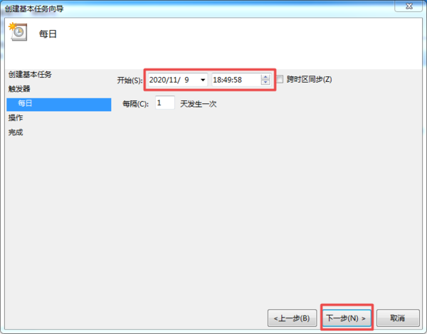 第七步,接下来,我们就需要设置(任务)触发器的触发频率了,如果我们每天都需要设置电脑定时关机,那么在此界面当中,我们就需要将触发器的触发频率选择为【每天】,具体的触发频率根据自己的实际需求来进行设定,然后点击【下一步】按钮。
