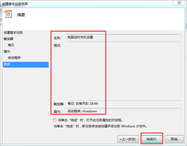 第十一步,最后我们在任务【完成】的界面当中,可以看到我们刚刚所设置好的任务的名称、描述、触发器以及操作内容,确认无误后,点击【完成】按钮。