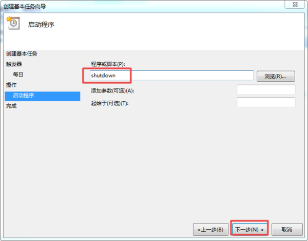 第十步,然后在【启动程序】界面中,我们设置该程序或脚本为【shutdown】,也就是【关机】的命令,然后点击【下一步】按钮。