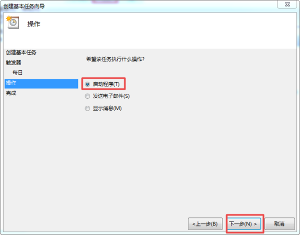 第九步,在接着我们在【希望该任务执行什么操作?】的设置步骤界面当中,选择第一个【启动程序】选项,然后点击【下一步】按钮。