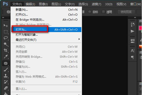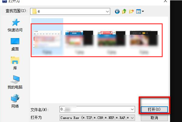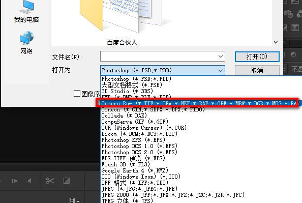 第三步,在弹出的选择打开文件的弹窗中,如下图所示,【打开为】处选择【Camera?Raw】格式。
