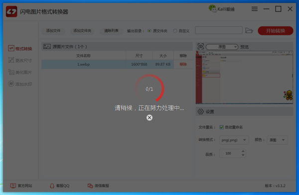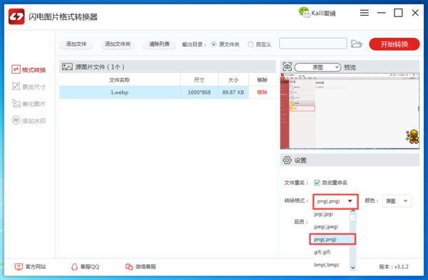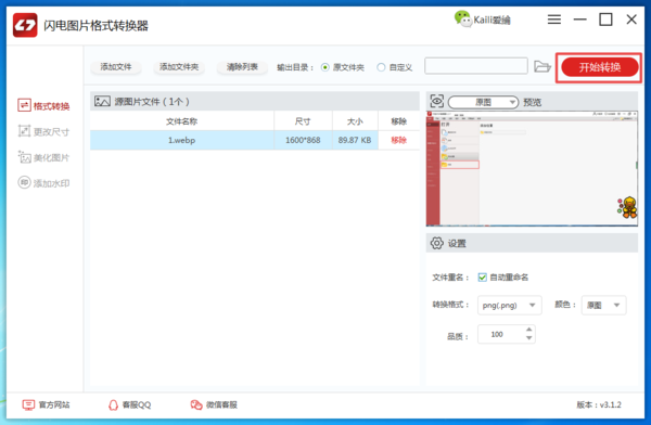 第五步,图片的转换格式选择完成后,我们找到界面右上角的【开始转换】按钮,对webp图片开始进行转换。
