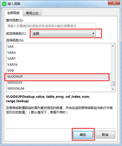 第四步,接着就会弹出【插入函数】的窗口了,在此界面当中,我们将函数的【选择类别】选择为【全部】,然后再在其下方找到【VLOOKUP】函数,并点击选择,最后点击【确定】按钮。