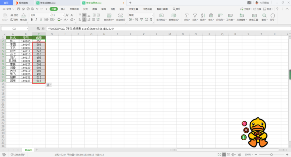 第九步,回到学生信息表当中后,我们可以看到,第一个同学的成绩就被成功的展示出来了。接着我们将鼠标放到第一个单元的右下角的位置,然后双击,向下进行数据的填充就可以了。