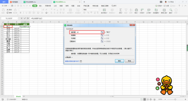 第五步,然后界面上就会弹出【函数参数】的设置窗口了,在此窗口的【查找值】参数,我们将它的参数选择为【学生信息表】当中的【A2】单元格,因为A2就是需要我们去学生成绩表当中匹配的数据。