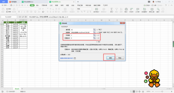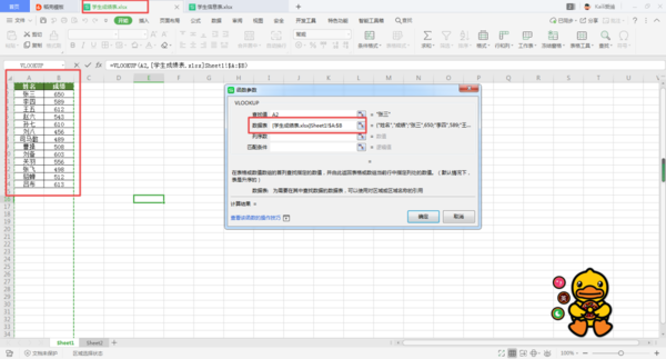 第六步,接着我们在【数据表】参数,选取需要进行VLOOKUP函数查找的数据区间范围,此时我们的数据查找的区间范围是:【[学生成绩表.xlsx]Sheet1!$A:$B】,也就是学生成绩表当中的所有数据。