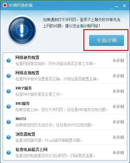 第二步,打开【断网急救箱】对话框之后,右上角的【全面诊断】按钮,会自动进行诊断并且修复360浏览器。