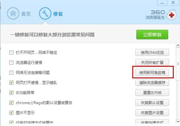 也可以在360浏览器急救医生修复选项中,点击【使用断网急救箱】选项。