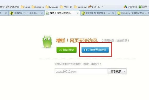 第一步,当然是要打开360断网急救箱,如下图所示可以在没有打开的网页中间点击【360断网急救箱】。