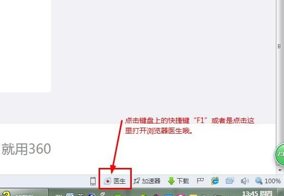 第一步,点击浏览器页面下方靠中间的位置,有一个【医生】选项,点击即可打开360浏览器医生,也可以在键盘上用【F1】键打开浏览器医生。