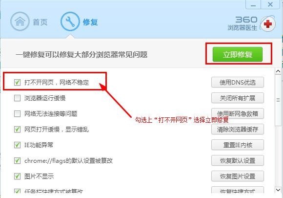 第三步,也可以点击【修复】选项卡,勾选上【打不开网页,网络不稳定】选项,然后点击右上角的【立即修复】按钮,进行浏览器修复即可。