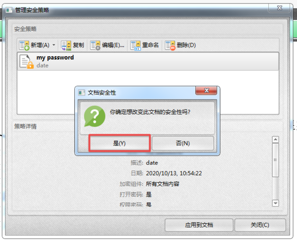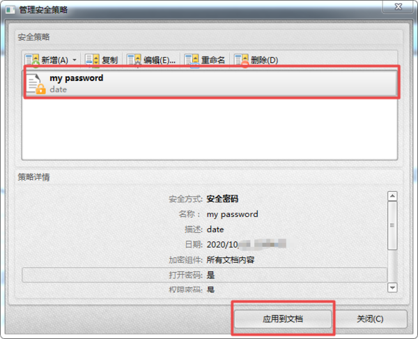 第十步,回到管理安全策略界面后,我们选中设置好的密码,然后点击窗口右下角的【应用到文档】的按钮。