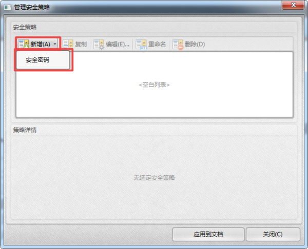 第六步,此时软件就会弹出【管理安全策略】的窗口,在此窗口的左上角的位置,我们找到【新增】选项,然后点击其右侧的下拉按钮,接着选择【安全密码】功能。
