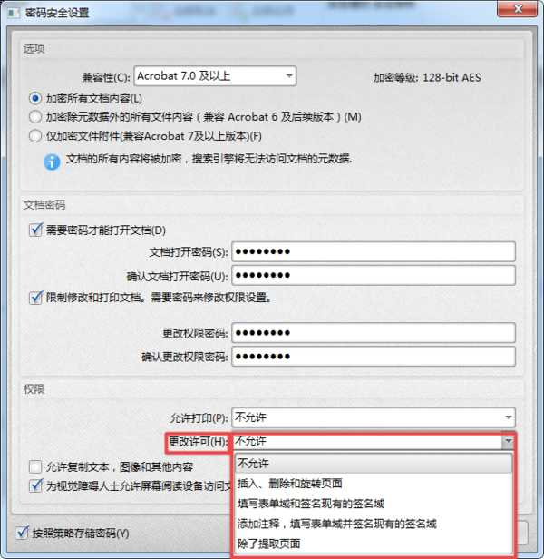 第七步,接着软件就会弹出【密码安全设置】窗口了,在这里我们既可以设置PDF文档的打开密码,也可以设置PDF文档的修改和打印密码,根据自己的需要来进行设置就可以了。