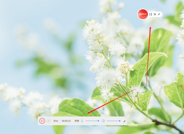 第六步,电脑录屏的时候,在屏幕右上角和正下方都有电脑录屏的悬浮窗口,可随时【开始/暂停/结束】屏幕录制。但是,摄像头的窗口是不显示在电脑屏幕上的,所以在电脑录屏之前就得先把摄像头大小调整好了。