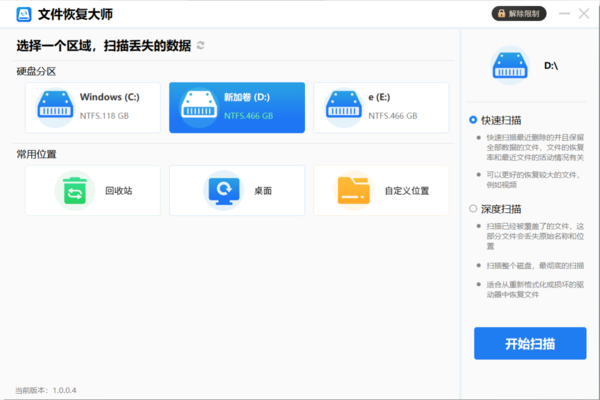 2.?常用位置:如果你知道确切的丢失文件路径,可以在常用位置中选择回收站、桌面、或者自定义位置进行扫描,扫描位置的文件数量越少,扫描速度越快。