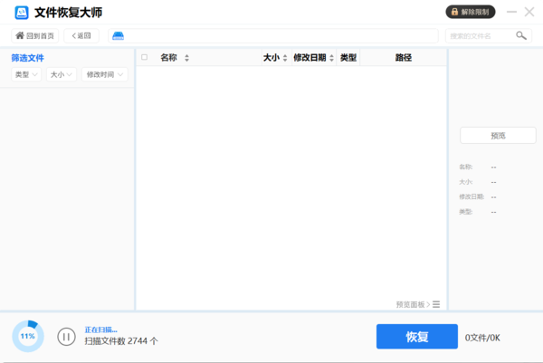 ●?筛选:可设置文件类型、修改时间段、文件大小更精准地过滤出您想要恢复的文件。