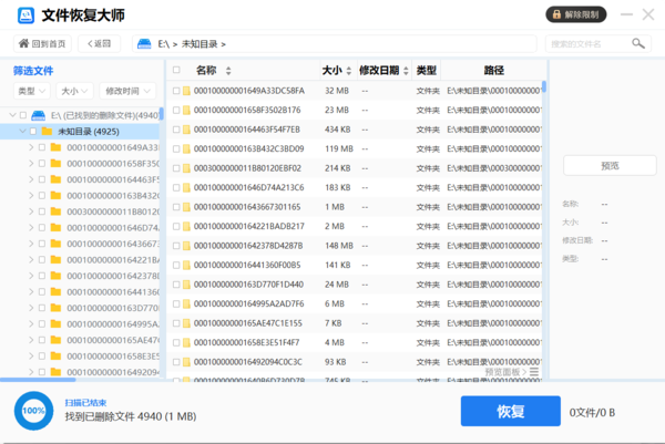 ●?文件路径:通过原有路径进行查找删除数据,但需要注意的是,如果选择按路径查找,需要查看目录树底部的未知路径,部分丢失路径的数据会被归类在该分栏下。