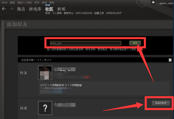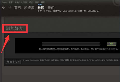 第三步,然后就会出现一个输入框,在这个输入框里写入好友的Steam?ID、游戏ID、真实姓名或者邮箱等个人资料,点击右边的【搜索】按钮就可以了,在页面下方搜出来的用户中,找到需要添加的好友,点击【添加为好友】即可。
