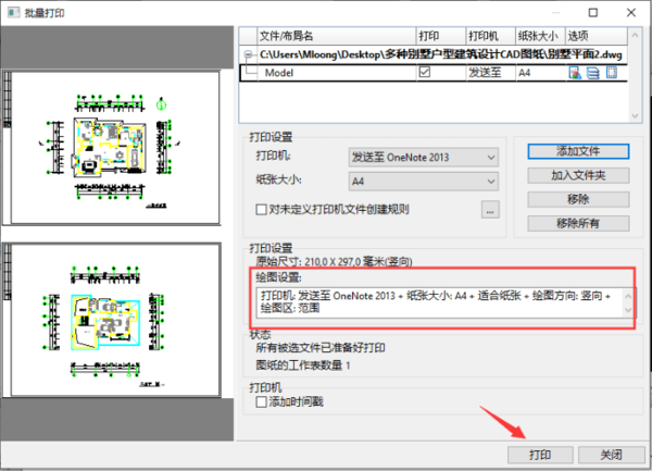 第五步,需要批量打印CAD图纸的各个选项都设置好了之后,直接点击右下角的【打印】按钮,进行CAD图纸批量打印即可。