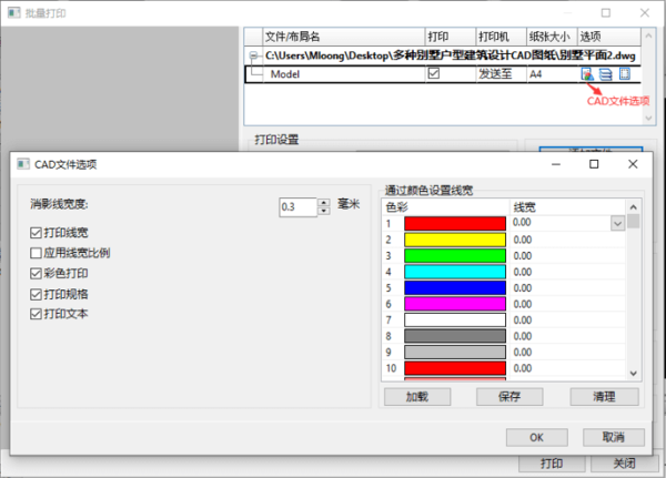 第三步,勾选需要打印的CAD图纸,然后点击图纸文件右下角的【CAD文件选项】,跳转到【CAD文件选项】窗口。在该窗口中,对CAD图纸打印的参数进行设置,比如打印线宽、彩色打印、打印文本等选项,设置完成之后,点击右下角的【OK】按钮即可。