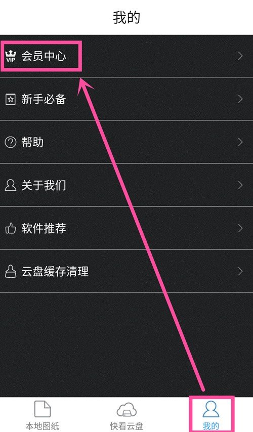 第三步,在电脑上把CAD图纸上传到快看云盘之后,接下来就要在手机上查看了。打开手机版CAD快速看图软件,然后点击【我的】页面下的【会员中心】。