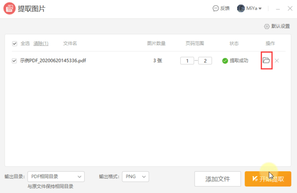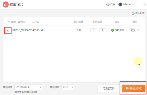 第四步,这时候会弹出【提取图片】的对话框,这个对话框中勾选需要提取图片的PDF文档,然后点击右下方【开始提取】按钮。
