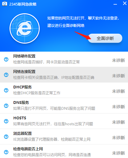点击后会弹出2345断网急救的对话框,我们点击【全面诊断】,即可对各个环节进行上网诊断,然后我们就可以对对应问题进行修复。