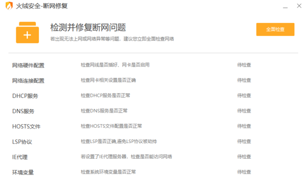 我们可以发现,火绒的断网修复框,和2345安全卫士的非常相似,也是我们点击【全面检查】,先对电脑检查一番,找出不能上网的原因并进行修复。