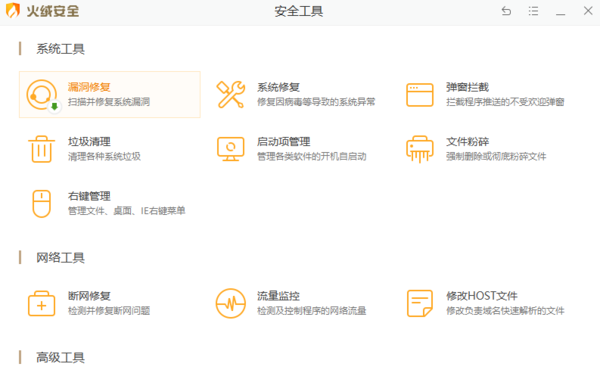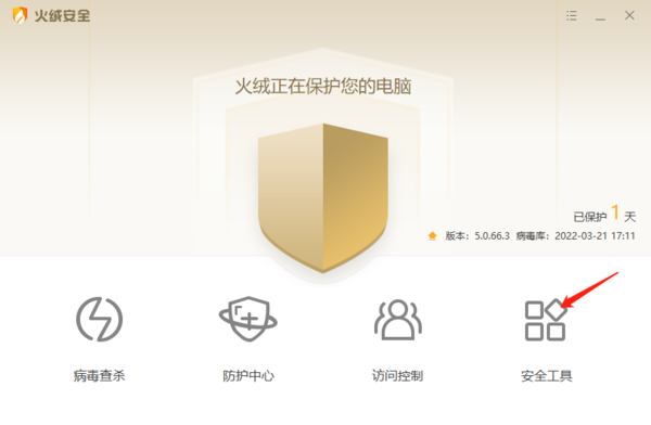我们打开火绒安全软件,来到主界面后,点击【安全工具】按钮,因为它的断网修复在该模块中。