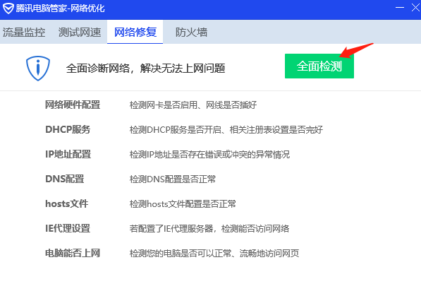 我们可以看到,腾讯电脑管家的网络修复是和其他网络类功能在同一框中,不过当前情况下我们不用理会其他功能,只需点击【全面监测】即可进行诊断并修复。
