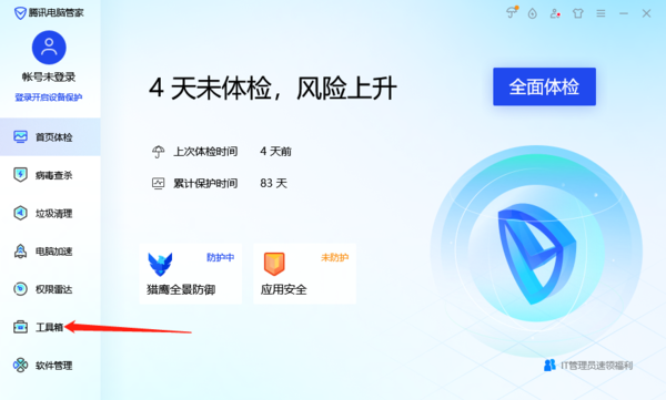同样地,打开腾讯电脑管家,在左侧模块栏,点击【工具箱】。
