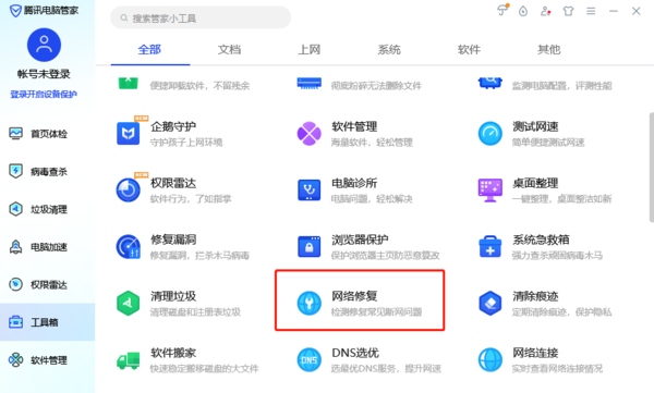 在工具箱界面中,可以找到【网络修复】,我们点击进入。(初次点击,可能会经历安装插件过程,请稍等)